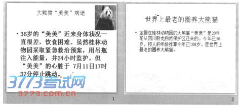 (3)在第一张幻灯片前插入一张版式为“空白”的幻灯片,并在位置(水平:0厘米,度量依据:左上角;垂直:5.13厘米,度量依据:左上角)插入“世界上最老的圈养大熊猫病逝”艺术字,艺术字样式为“填充一白色,暖色粗糙棱台”,文本效果为“转换一下弯弧”。背景为“胡桃”纹理。第三张幻灯片的版式改为“两栏内容”,将第二张幻灯片的图片移到第三张幻灯片右侧内容区域,图片的动画设为“旋转”,文本动画设为“向内溶解”。动画出现顺序为先文本后图片。移动第二张幻灯片成为第三张幻灯片。