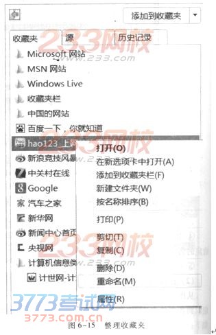 当收藏夹中的网页地址越来越多,为了便于查找和使用,就需要利用整理收藏夹的功能进行整理,使收。藏夹中的网页地址存放更有条理。如图6—15所示,在收藏夹选项卡中,在文件夹或Web页上单击右键就可以选择复制、剪切、重命名、删除、新建文件夹等操作,还可以使用拖曳的方式移动文件夹和Web页的位置,从而改变收藏夹的组织结构。