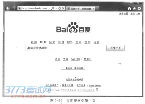 ①在IE的地址栏中输入WWW.baidu.com打开百度搜索引擎的页面。在文本栏中键入关键词,如“奥运会比赛项目”,如图6—16所示。