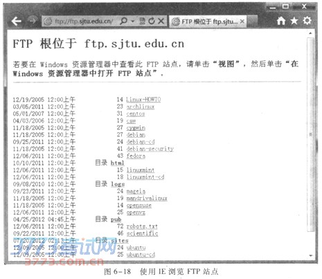 ②如果该站点不是匿名站点,则IE会提示输入用户名和密码,然后登录;如果是匿名站点, IE会自动匿名登录(如本例中的上海交通大学FTP站点)。登录成功后的界面如图6—18所示,