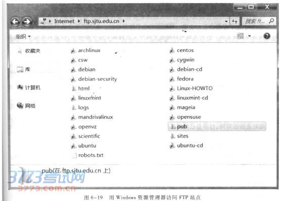 另外,也可以在Windows资源管理器中查看FTP站点,操作步骤如下: ①在“开始”按钮 上单击右键,选择“打开Windows资源管理器”,或在桌面上找到“计算机”图标并双击打开。 ②在资源管理器的地址栏输入FTP站点地址,敲回车。如图6—19所示,就和访问本机的资源管理器一样。可以双击某个文件夹进入浏览。