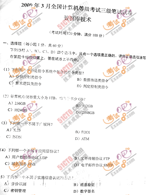 2009年3月计算机等级考试试题及答案三级数据库笔试
