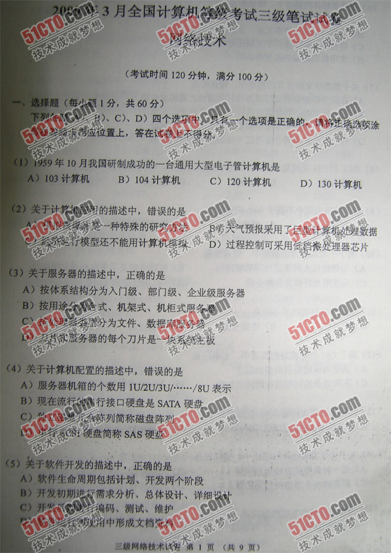 2009年3月计算机等级考试三级试题-网络技术笔试