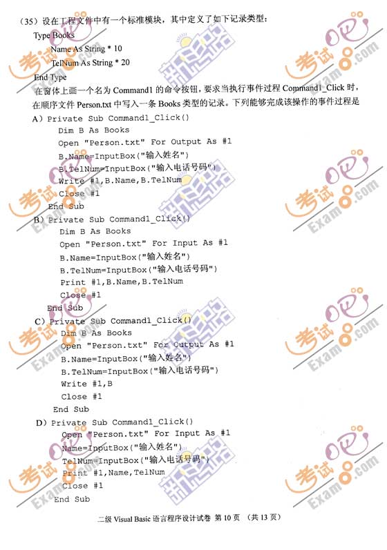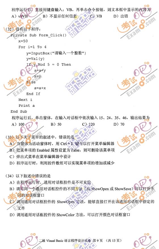 2009年3月计算机等级考试二级VB笔试试题及答案