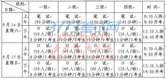 开考时间为2017年9月16日至17日。开考级别为一级、二级、三级、四级。各级别具体考试时间安排如下: