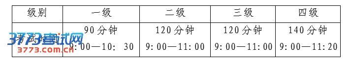 一级B: 3分钟/1名考生;一级:8分钟/2名考生;二级:10分钟/2名考生;三级:10分钟/2名考生;四级:12分钟/2名考生。
