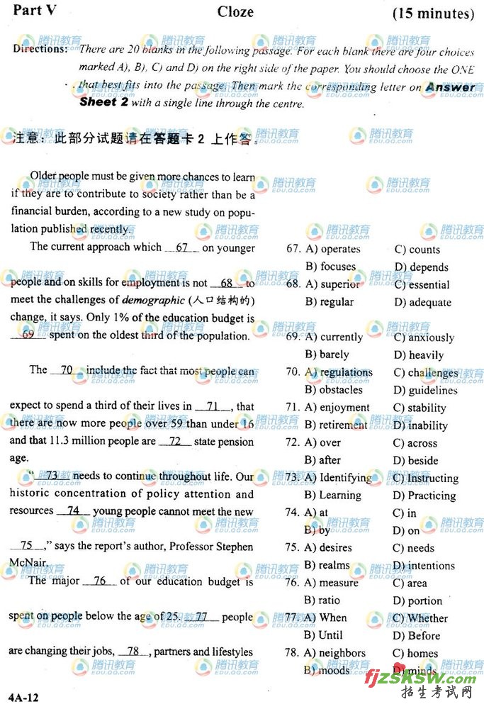 2009年12月大学英语四级试题真题A卷及答案