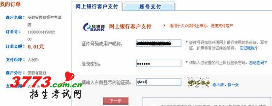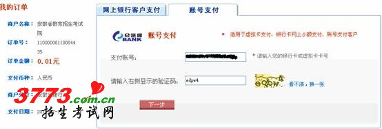 1、考生报名成功,选择建行缴费后,通过“账号支付”,输入支付账号和验证码,点击“下一步”;