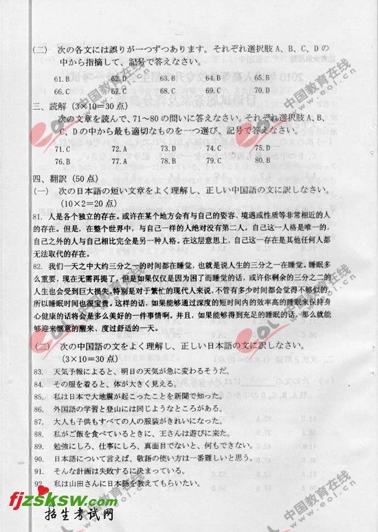 2010年成考专升本日语试题答案