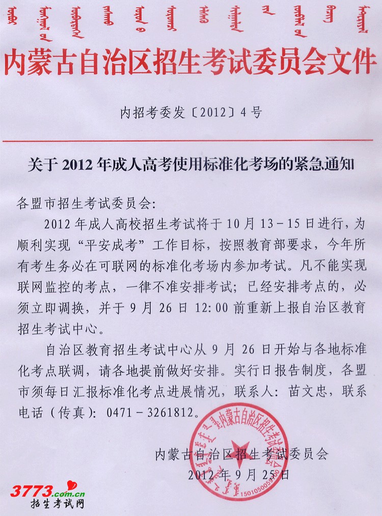 关于2012年内蒙古成人高考使用标准化考场的紧急通知