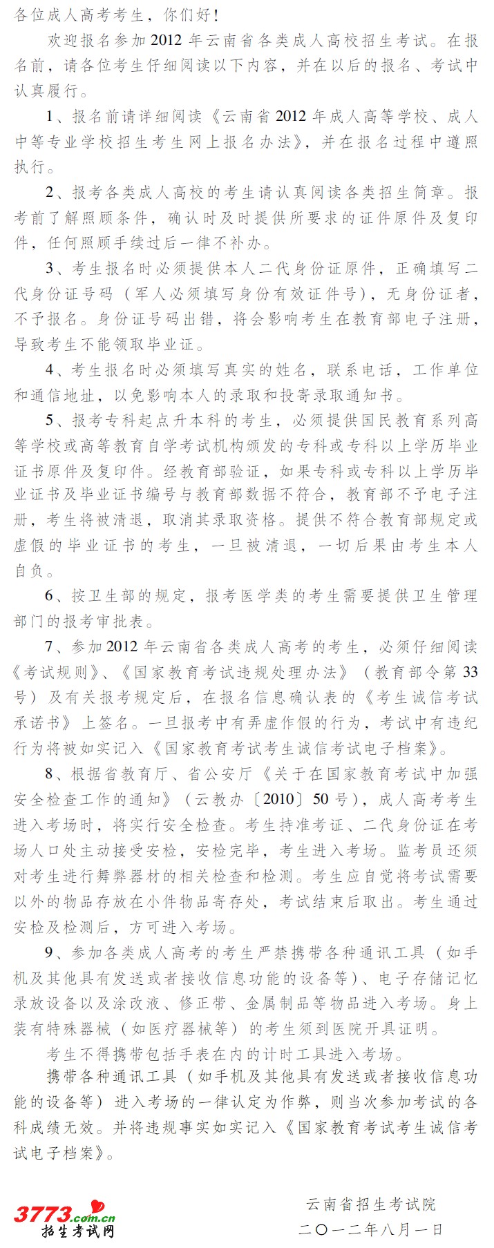 云南省2012年成人高校成人中专学校招生考生网上报名办法