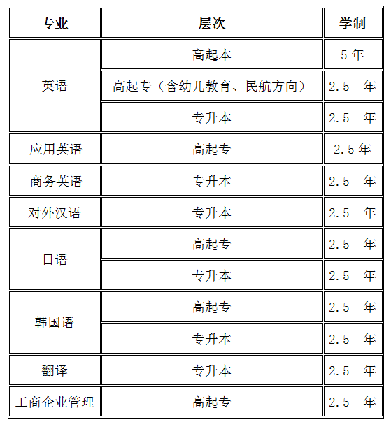高起专(两年半):应用英语、英语(含幼儿教育、民航方向)、
