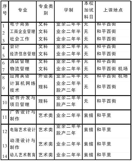 第二条 我校成人高等学历教育分业余、脱产学习形式,学制:业余二年半,脱产二年。其中业余授课方式为周一至周五的两个晚上,周六或周日的一个白天上课。业余专业及上课地点:和平里(艺术类各专业);和平西街(文史类、外语类、理工类);机场(应用英语、物流管理专业)。脱产授课方式分为全脱产和半脱产,全脱产学习是周一至周五白天上课,半脱产为双休日加一个工作日学习。脱产专业及上课地点:和平里(电脑艺术设计);和平西街(计算机网络技术、软件开发与项目管理)。