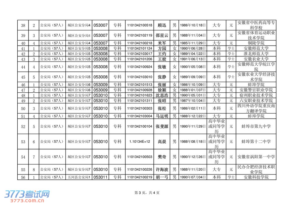2013安徽蚌埠政法干警招录拟录取人选名单公示