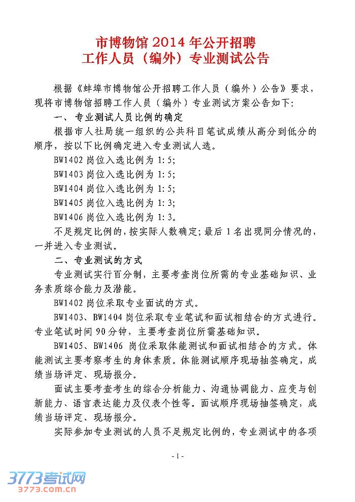 安徽蚌埠市博物馆2014招聘编外专业测试公告