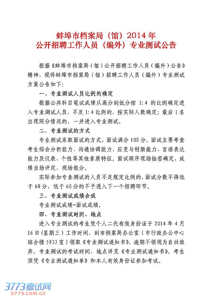 安徽蚌埠市档案局(馆)2014招聘编外专业测试公告