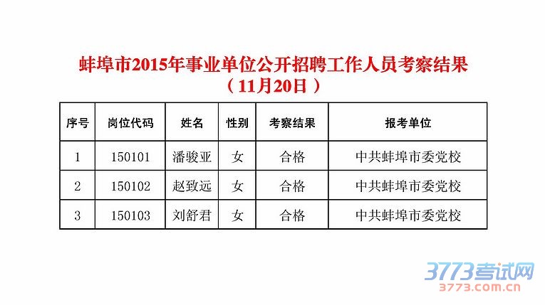 2015安徽蚌埠市事业单位招聘考察结果(11月20日)
