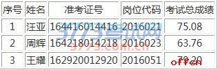 因体检、考察等环节,岗位2016014、2016015、2016021、2016023、2016025均有1人放弃,根据《桐城市2016年事业单位公开招聘人员公告》规定,上述岗位可等额递补5人,2016014、2016015两岗位没有候补人选,实际能递补3人,现依据应聘者考试总成绩由高分到低分(同分依规)依次递补人员名单公布如下: