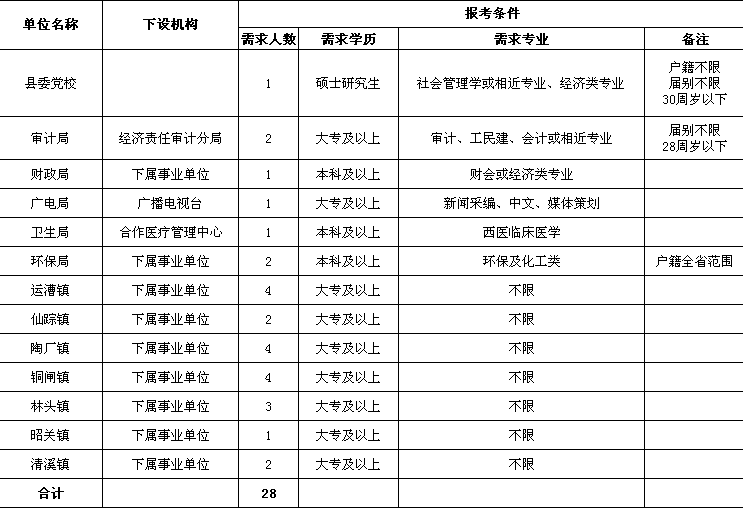 一、招聘名额、范围和条件 1、招聘名额:28名。其中县直机关二级事业单位8名,镇级二级事业单位20名。 2、招聘范围及条件:2007、2008、2009届回含山报到的含山籍全日制普通高校未就业的非师范类大专及以上学历毕业生(县委党校报考职位户籍、届别不限,年龄30周岁以下;审计局报考职位届别不限,年龄28周岁以下;环保局报考职位届别不限,户籍放宽到全省范围)。 具体招聘职位、条件见《含山县招聘事业单位工作人员职位简章》。