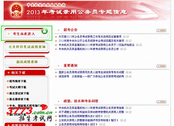 2013国家公务员考试报名系统使用方法详细图解 1、进入国家公务员考试专题(点击“考生由此进入”,如下图。