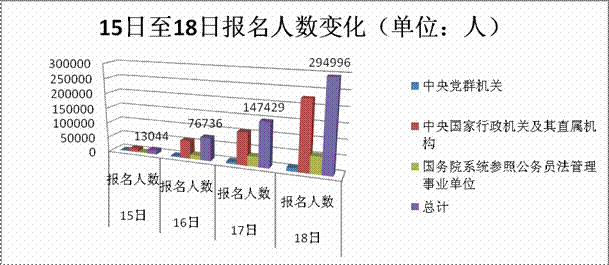 18日是2013国家公务员考试报名的第四天,17日华图公务员考试研究中心专家预计国考报名人数将持续猛增,今天得到了验证,部分持有观望状态的考生开始报名,预计在未来今天内还会出现报名高涨的情形,华图公务员考试研究中心专家建议考生一定要为自己预留审核时间,切勿等到最后时间报名。在此提醒考生把握报考节奏,抓紧时间筛选最适合自己的职位,理性报考。现对15日至18日国考报名四天变化情况做分析,希望能为考生报考提供指导意见。
