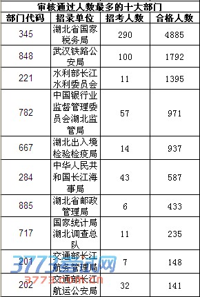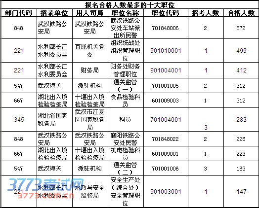 截止23日上午8时,通过审核人数前三位的部门依次是:湖北省国家税务局,武汉铁路公安局,水利部长江水利委员会,通过审核人数分别为:4885人, 1792人, 1395人。通过审核人数前三的岗位依次为:武汉铁路公安局的武汉铁路公安处车站派出所民警职位,水利部长江水利委员会直属机关党委的组织统战处组织管理职位,水利部长江水利委员会财务局的财务处财务管理职位,通过审核人数分别为:572人,499人,412人。