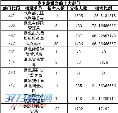 截止23日上午8时,竞争比例最大的三位的部门依次是:水利部长江水利委员会,湖北省邮政管理局,湖北出入境检验检疫局,竞争比例分别为:126.8:1 ,72.1:1 ,66.9:1。