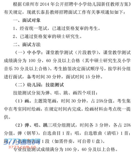 2014年福建漳州市长泰县招聘中小学幼儿园教师面试通知