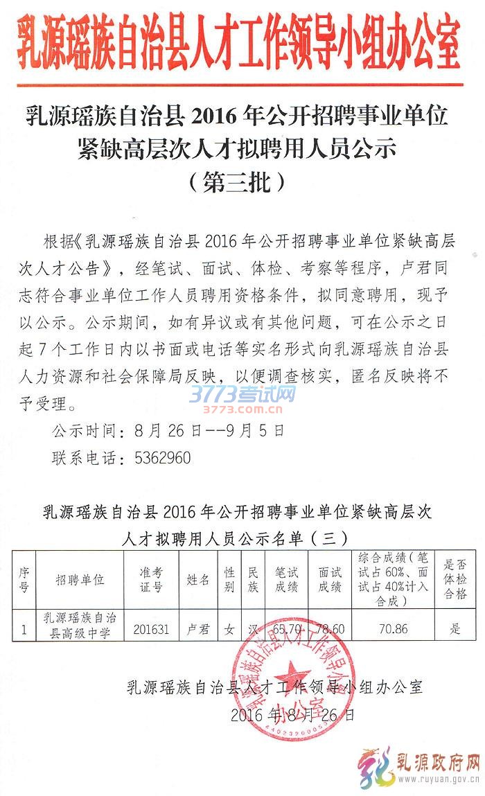 2016广东乳源瑶族自治县事业单位拟聘公示(第三批)