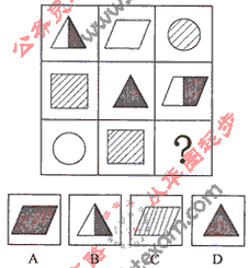 【华图解答】本题正确答案为D。9个图形从上至下从左至右的图形依次为三角形、平行四边形、圆形和长方形,且每个图形内的花纹与其上下左右的图形全异。故答案为D。