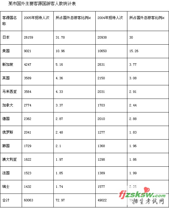 【国家公务员网专家解析】:本题从表面上看,可以使用尾数原则的方法进行估算,因为在表格的最下方一行已经给出了2005年和2004年招待的国外游客“合计”人数,很轻易可以发现60063与49022差值的尾数是1,答案落在了A选项上。看似毫无问题,却在不知不觉中已经落入了出题者的小陷阱。题目中问的是国外游客总人次的增加量,而表格中给出的“合计”数目却并不是总人数,要除以各自占总人数的百分比才可以。即2005年比2004年增加的国外游客总人数应该是60063