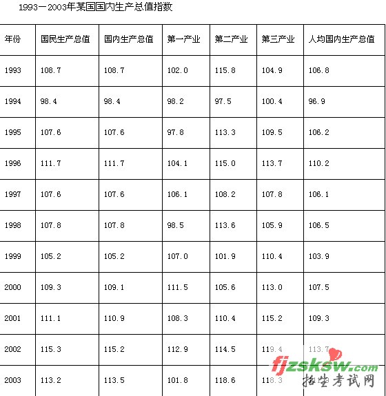 【国家公务员网专家解析】:本题最容易产生的一种固定思维,是把表格中的指数当成绝对量进行比较。如果单纯比较数值大小的话,很容易误选C项,因为1994年第三产业指数100.4小于1993年的104.9。事实上,资料中给出的数值都表示当年与前一年生产总值的比值,只要该指数大于100,就说明当年的生产总值高于前一年份,C项的说法没有问题。同理B项也正确,A项经过计算也可以证明正确,只有D项的说法错误。