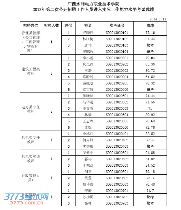 根据《广西壮族自治区事业单位公开招聘人员实施办法》(桂人社发〔2011〕155号)和《广西水利电力职业技术学院2013年第二次公开招聘工作人员公告》,经学院审核,现将本次公开招聘实际工作水平考试成绩予以公告。具体名单见附件。