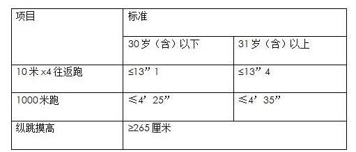 体能测评的项目和标准体能测评的标准,参照《关于印发公安机关录用人民警察体能测评项目和标准(暂行)的通知》(人社部发[2011]48号)的标准,具体如下: