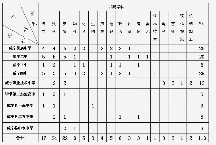 全县拟面向社会公开考聘高中各科教师110名。其中:威宁民族中学26名;威宁第二中学20名;威宁第三中学8名;威宁第四中学28名;威宁职业技术中学12名;毕节第三实验高级中学5名;威宁县小海中学3名;威宁县黑石中学5名;威宁县中水中学3名。各学校具体学科职位如下表: