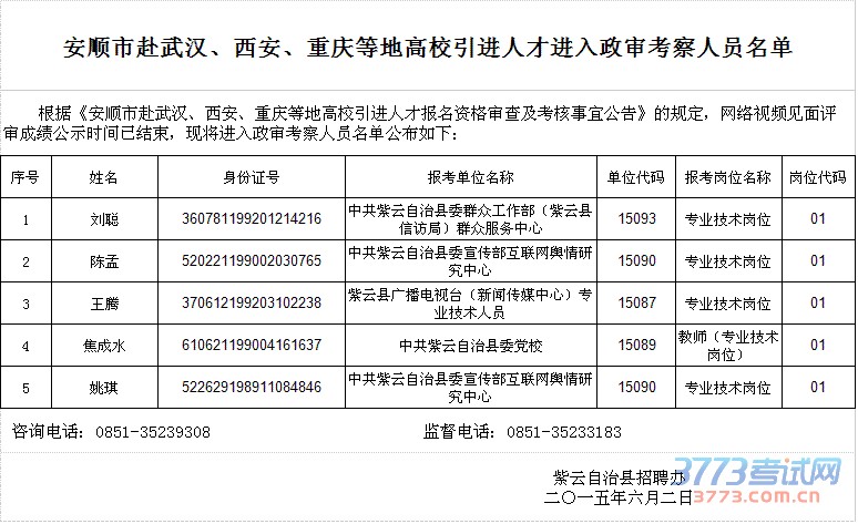 2015安顺市赴武汉、西安、重庆等地高校引进人才进入政审考察人员名单