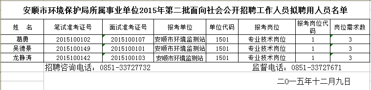 根据《安顺市环境保护局所属事业单位2015年第二批面向社会公开招聘工作人员简章》的规定,安顺市环境保护局所属事业单位公开招聘工作人员考察工作已于2015年12月2日结束,现需将拟聘用人员予以公示,公示时间为2015年12月9日至12月15日。如对公示对象有问题反映,请在公示期间向安顺市环境保护局公开招聘领导小组办公室反映。