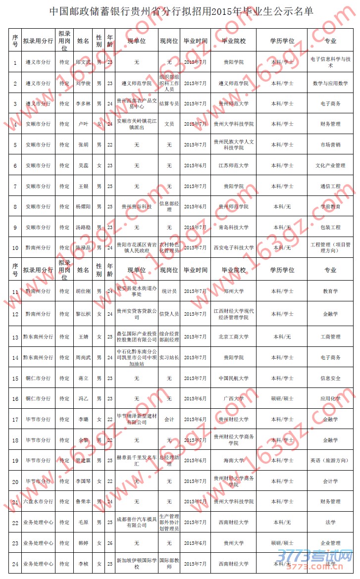 中国邮政储蓄银行贵州省分行关于2015年应届大学生拟录用名单的公示(三)为贯彻落实《人力资源社会保障部关于国有企业招聘应届高校毕业生信息公开的意见》(人社部发[2014]79号)要求,中国邮政储蓄银行贵州省分行拟录用2015年应届大学生24人,现对拟录用大学生名单进行公示,接受监督,详细名单见附件。公示时间:2015年12月15日-21日监督电话:0851-88168166附件: