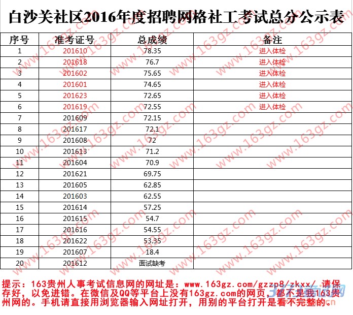根据白沙关社区公开招聘网格社工的方案,社区公开招聘计算机测试、面试工作已经结束,现将公开招聘总成绩、进入体检名单及有关事宜公告如下: