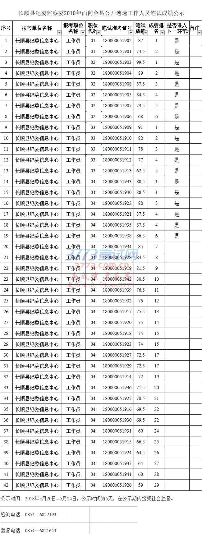 2018贵州长顺县纪委监察委遴选笔试成绩公示