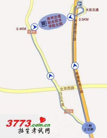 如图蓝色标线可从210国道或贵遵高速到交通职业技术学院(北院)。从三桥立交桥出发走贵遵路到交通职业技术学院北院大约2.5公里,或从三桥立交桥出发走210国道到交通职业技术学院北院大约2.4公里。(以上路线仅供参考)