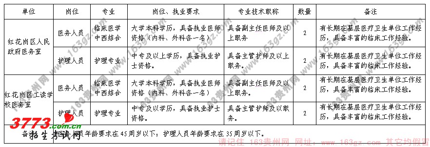 根据工作需要,红花岗区卫生和食品药品监督管理局现面向全省选调红花岗区人民政府医务室、红花岗区工读学校卫生室医务人员8名。