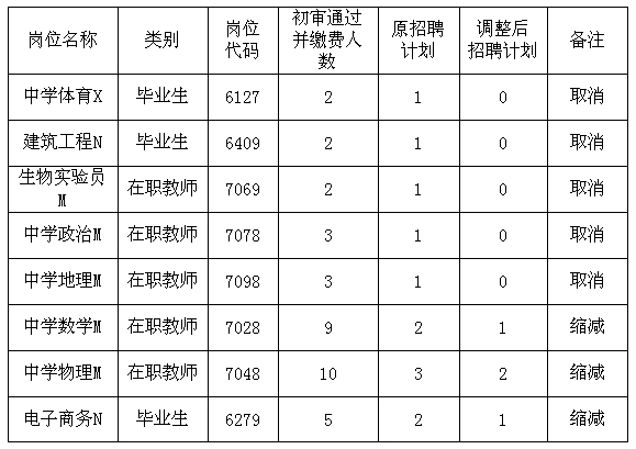 长沙高新区2014年公开招聘教师工作,已完成报名、资格初审、缴费等程序,根据《长沙高新区2014年公开招聘教师简章》规定,“各岗位报名人数与招聘计划数的比例达到5:1(含5:1)方可开考,达不到此比例则取消或缩减该岗位招聘计划数”。根据报名及资格初审、缴费情况,有中学体育X(岗位代码 6127)等5个岗位取消招聘计划,有中学数学M(岗位代码7028)等3个岗位缩减招聘计划,具体如下: