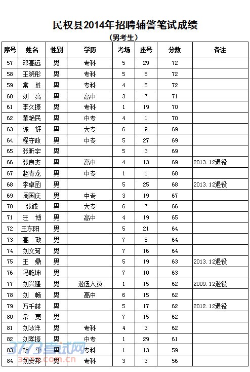 2014年河南商丘民权县招聘公安辅助人员笔试成绩公告