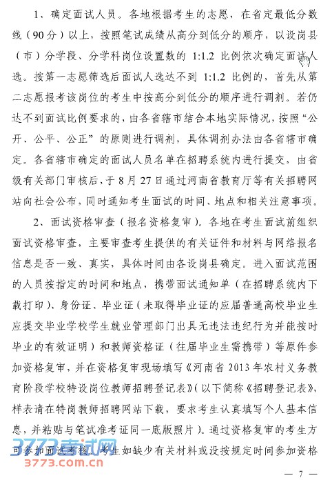 2012河南特岗教师招聘分数线为90分8月17日起面试