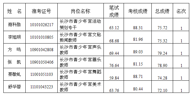 共青团长沙市委所属事业单位公开招聘,经报名、资格初审、笔试、资格复审、考核等程序,以下6人进入体检,现公示如下。