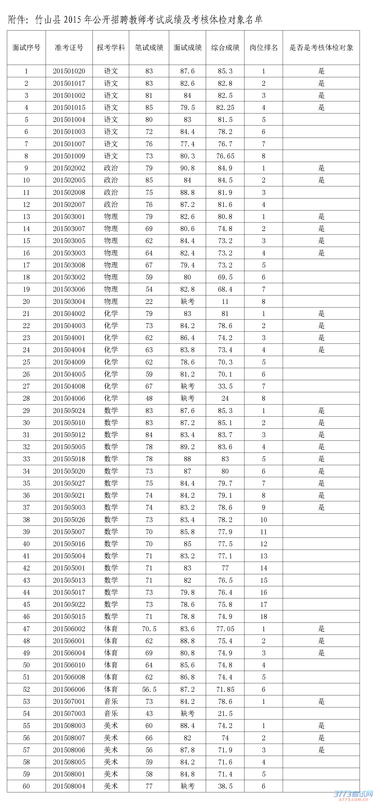 按照《竹山县2015年公开招聘农村初中教师公告》精神,现将公开招聘初中教师考试成绩及拟体检考核对象(见附件)予以公告。请拟考核、体检对象于2015年8月21日上午7:30在县教育局集中领取调档函、政审表等考核材料,并到指定医院参加体检(空腹,费用自理)。