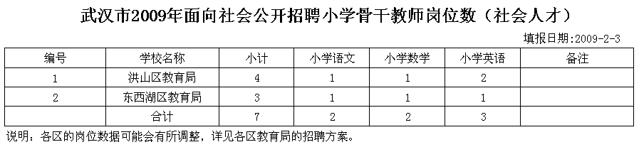 武汉市2009年招聘小学骨干教师岗位人数(社会人才)