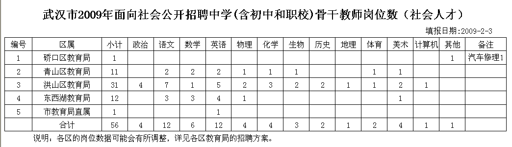 武汉市2009年招聘小学骨干教师岗位人数(社会人才…