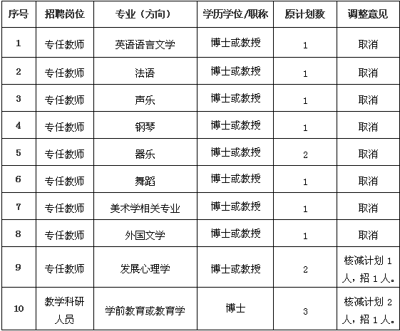根据《2014年长沙师范学院公开招聘方案》要求,我院于3月31日—4月10日组织了公开报名,4月11日至17日根据岗位招聘要求进行了资格审查,现报名工作已经结束,因部分岗位无人报考或未通过资格审查,结合我院实际,经学院公开招聘工作领导小组研究,报省人力资源和社会保障厅同意,对以下岗位予以取消或核减招聘计划,具体调整如下: